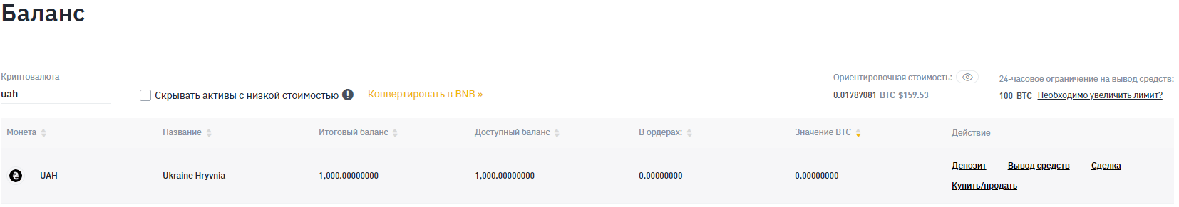 После подтверждения деньги буквально в течение нескольких секунд уже появились на Binance. Итого за перевод 1000 гривен я заплатил 30.93 гривны или 3.093 процента от суммы перевода. Далее переходим на вкладку своего баланса и ищем нашу валюту — в моём случае UAH. Нажимаем «Купить/продать».