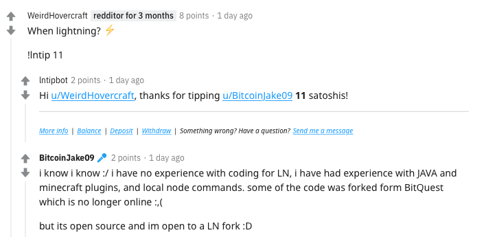 На данный момент все транзакции фиксируются в цепочке. Однако создатель выразил готовность посотрудничать над интеграцией поддержки Lightning Network, так как сам не знает, как это сделать. Вот его сообщение на популярном социально-новостном форуме Реддит.