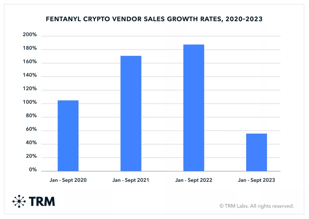 С 2019 года связанные с фентанилом денежные потоки, отслеживаемые TRM Labs, увеличивались в среднем на 155% в год. В 2023 году рост пока составляет лишь 60%, сообщили в компании.