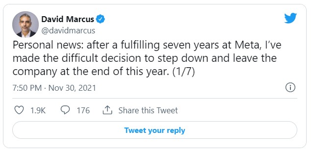 Вчера Маркус зашел в Twitter, объявив о завершении своего семилетнего пребывания в Meta. Рынок бушует слухами о том, что выход Маркуса произошел из-за того, что Meta провалила первоначальный проект, чтобы запустить собственную криптовалюту для трансграничных онлайн-платежей через продукты Facebook.