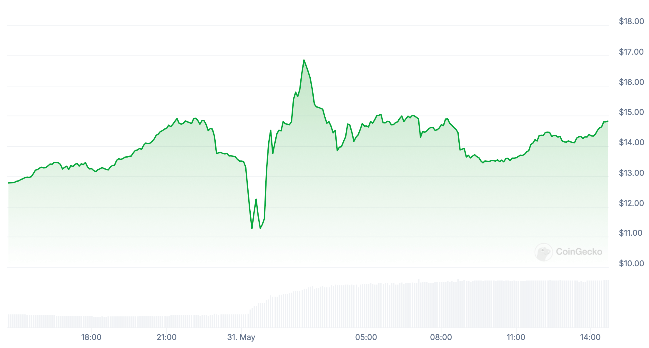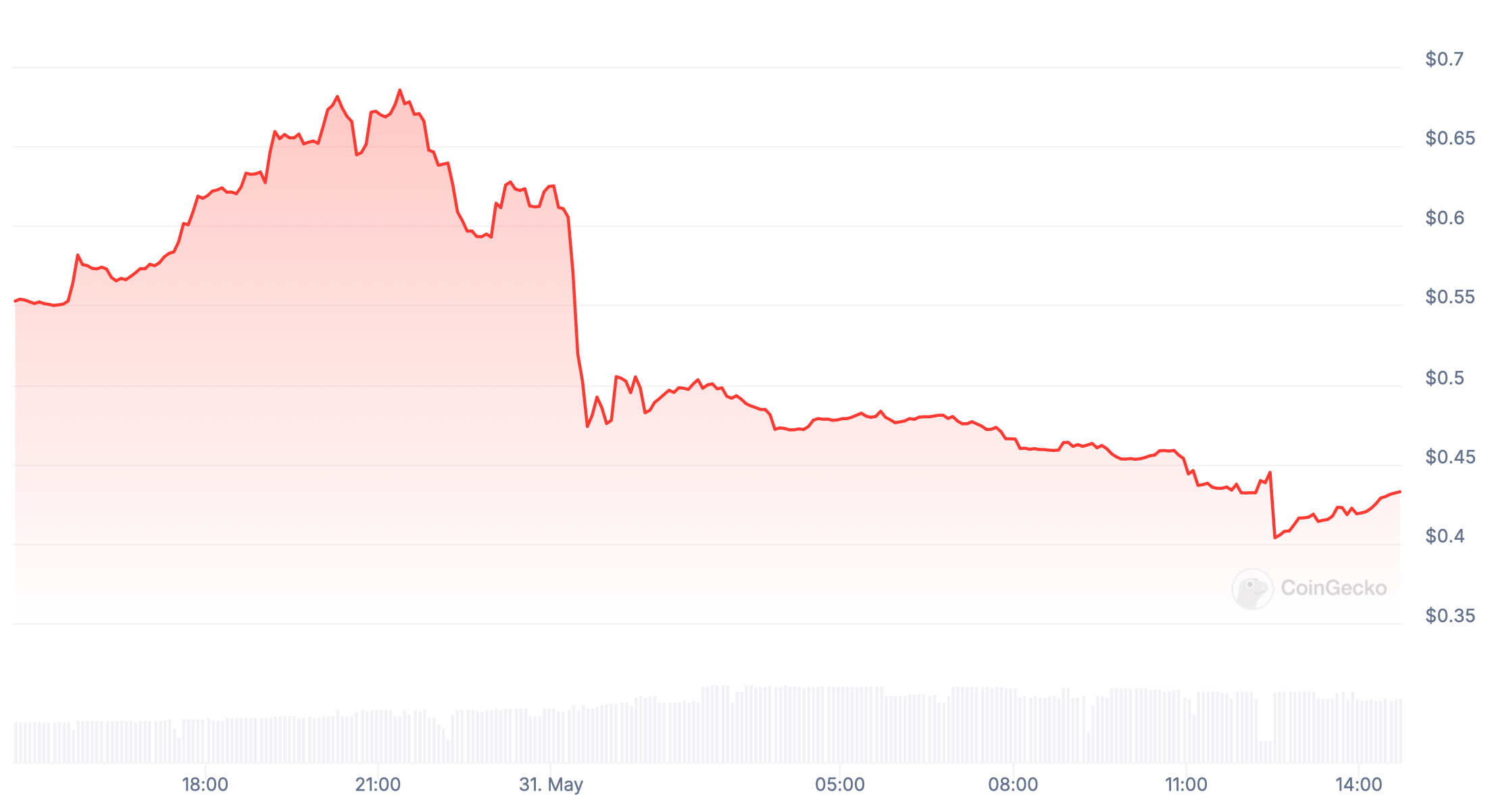 Вот его график за последние сутки, на котором видна просадка актива в ответ на выход соответствующих новостей.