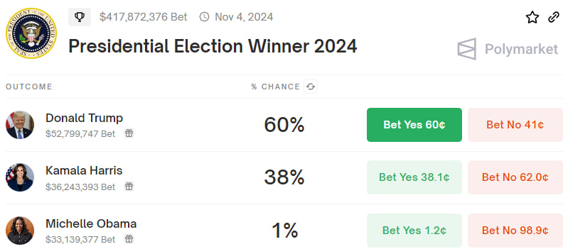 Отметим, шансы Харрис на победу в выборах оценивают в 38%, вероятность того, что Дональд Трамп станет президентом США составляет 60%, по данным Polymarket.