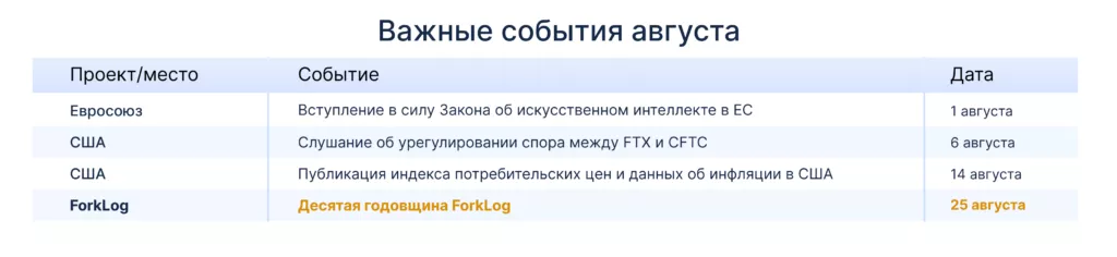 В последний день июля журнал ForkLog подготовил традиционный календарь важных событий на следующий месяц.