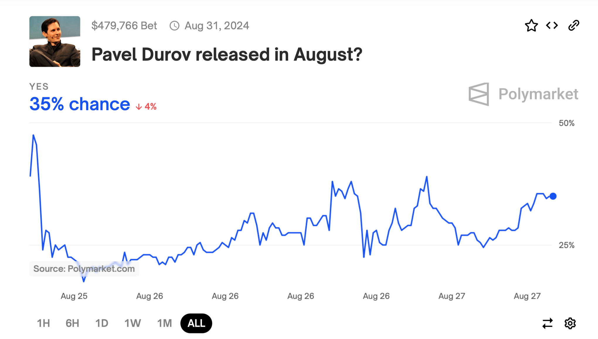 А пока пользователи децентрализованной платформы Polymarket делают ставки в крипте на то, отпустят ли Павла Дурова до конца августа. Сейчас такая перспектива оценивается в 35 процентов, причём объём ставок приближается к уровню 500 тысяч долларов.
