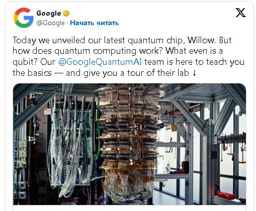 Google объявила 9 декабря, что разработала квантовый вычислительный чип, названный «Willow». Чип выполнил вычисление, которое заняло бы у суперкомпьютера десять септиллионов (10 25) лет, за 4,69 мин. Руководитель отдела квантового ИИ Google Невен сказал, что «Willow» стал прорывом в квантовой коррекции ошибок. Есть предположения, что новые разработки могут угрожать криптографии.
