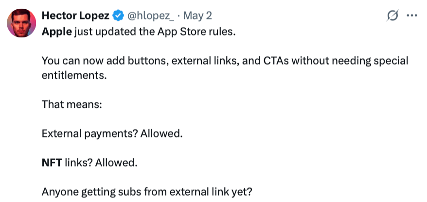 Михаэли подытожил обновление Apple следующим образом: теперь приложения могут размещать ссылки, ведущие на внешнюю коллекцию невзаимозаменяемых токенов (NFT), за пределы App Store и на внешнюю платежную систему без необходимости получения разрешения.
