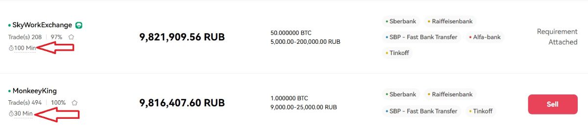 Операции купли-продажи криптовалют совершаются вручную, из-за этого на их выполнение порой уходит много времени. Чтобы избежать долгого ожидания, обращайте внимание на лимит по сроку совершения транзакции, указанный в объявлении, и отдавайте предпочтение вариантам с небольшим ограничением. Но обычно трейдеры быстро выходят на связь, и сделки выполняются за 10-15 минут.