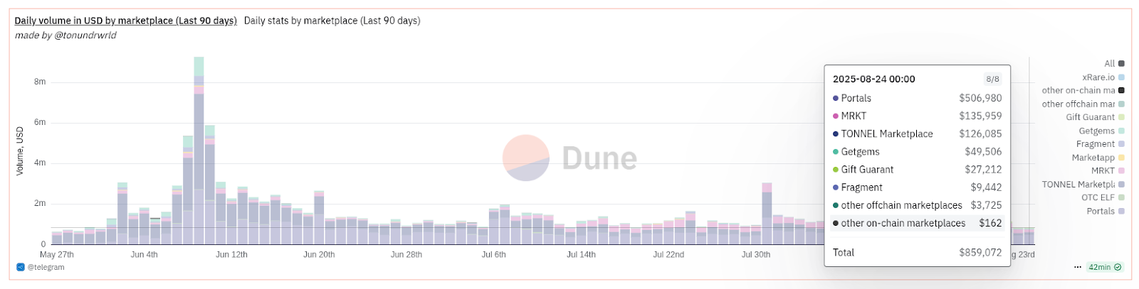Подарки торгуются на нескольких маркетплейсах, крупнейший из которых — Portals. Платформа удерживает 50–60% всех объемов торгов.