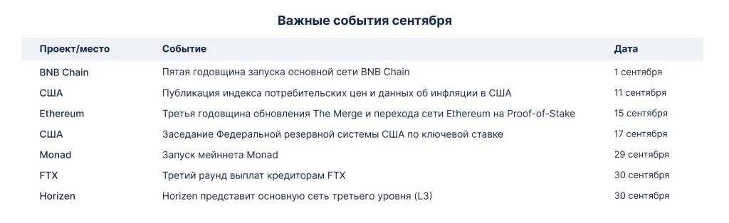 - 15 сентября — третья годовщина обновления The Merge и перехода сети Ethereum на Proof-of-Stake.
