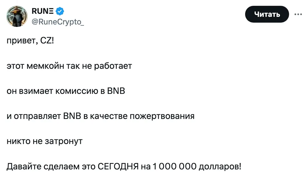 Однако позже RUNE пояснил, что «мемкоин работает иначе» и вместо этого взимает комиссию в BNB, отправляя токены в качестве пожертвования, так что «никто не пострадает».