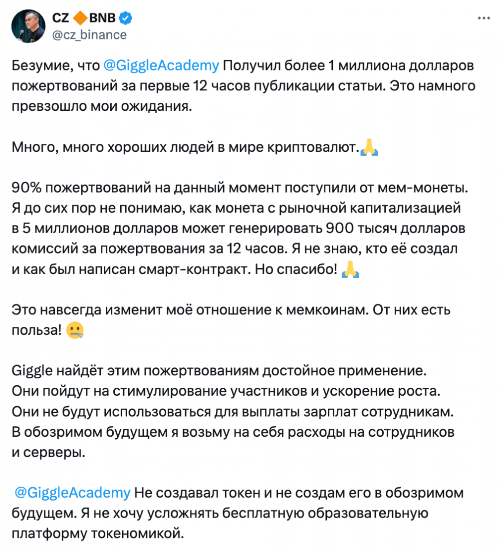 Значительная часть пожертвований поступила от мемкоина «GIGGLE», запущенного фондом Giggle Fund. Этот фонд перечисляет торговые комиссии за мемкоин в виде BNB в Giggle Academy.