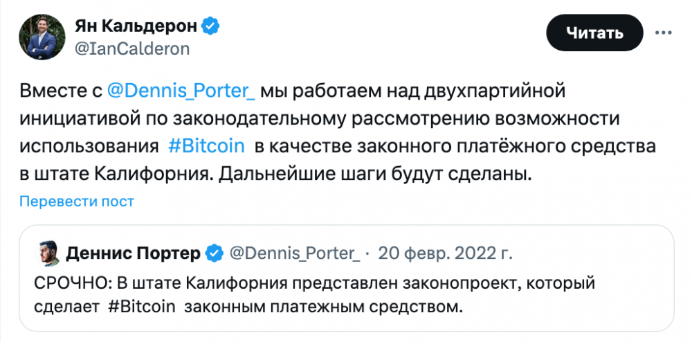 Кальдерон также заявил, что будет настаивать на использовании биткоинов в Калифорнии для оплаты государственных программ.