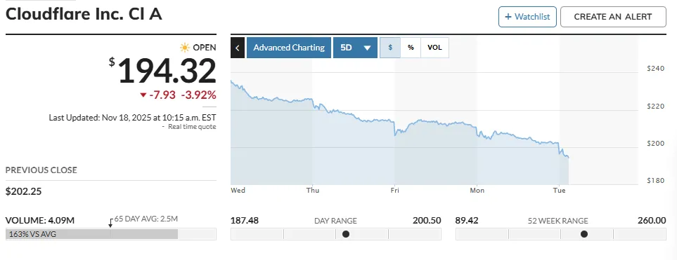 На фоне инцидента акции Cloudflare Inc (NET) упали на 3,9% — до $194.