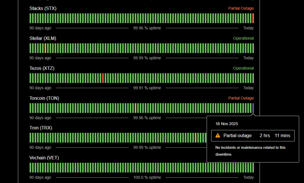 Аналитики компании также отслеживают сбои в блокчейнах. По их данным, проблемы коснулись монет EGLD, ADA, ICX, FIL, KAS, OSMO, STX, MINA, ICP. Кроме того, фиксируются ошибки в сети Toncoin.