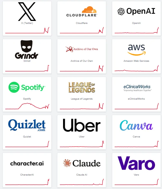 Среди крупных пострадавших платформ — соцсеть X, сайт OpenAI, музыкальный сервис Spotify, Amazon Web Services (AWS), такси Uber, видео-игра League of Legends и другие.