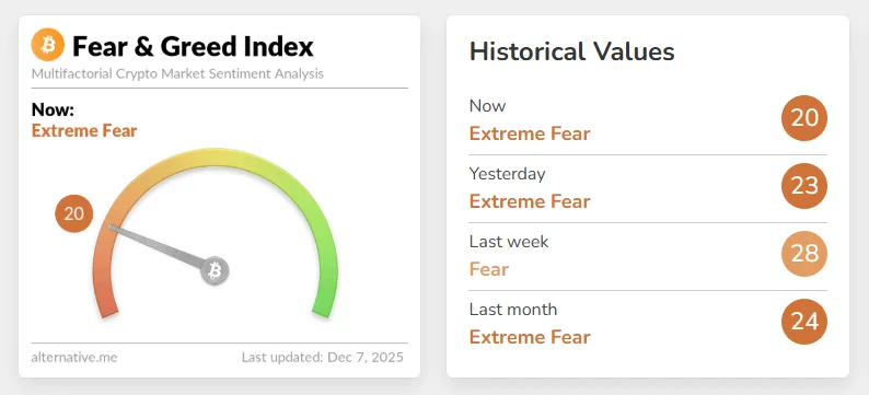 Популярный индикатор рыночных настроений находится на уровне 20 баллов, сигнализируя об «экстремальном страхе».