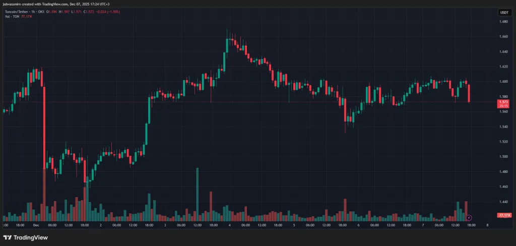 Котировки TON почти не отреагировали на запуск. На момент написания актив торгуется по $1,57.