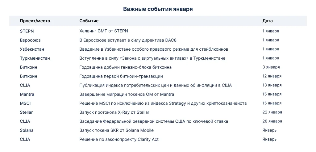- 15 января — решение MSCI по исключению из индекса Strategy и других криптоказначейств.