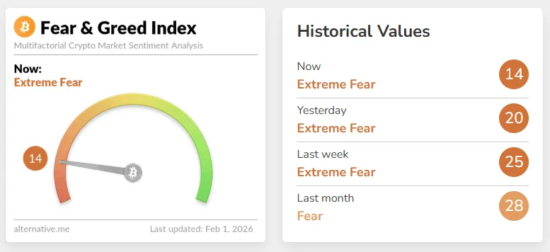 Криптовалютный индекс страха и жадности упал до 14 баллов впервые с середины декабря 2025 года.