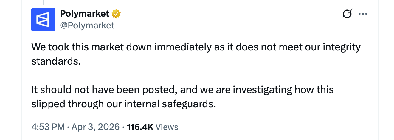 Polymarket ответила в течение нескольких часов. В прямом ответе на X компания написала, что рынок был немедленно удален, поскольку он не соответствовал ее стандартам честности, что его не следовало публиковать, и что ведется внутреннее расследование, чтобы определить, как он прошел проверку защитных механизмов платформы.