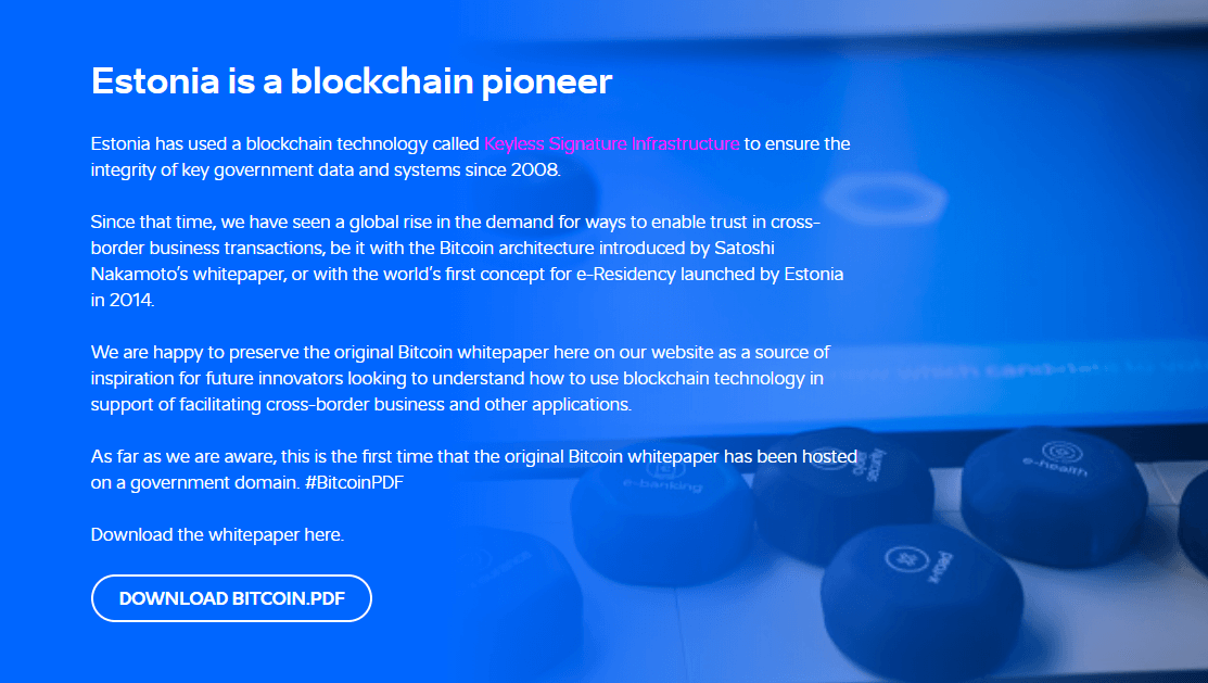 Главный документ Биткоина можно найти на официальных сайтах некоторых правительств, включая Колумбию, Эстонию и Соединенные Штаты Америки. К примеру, на сайте эстонского правительства закрепленный вайтпейпер сопровождается следующим сообщением.