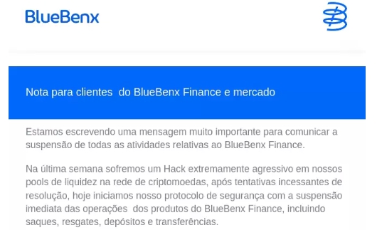«На прошлой неделе мы подверглись чрезвычайно агрессивному взлому наших пулов ликвидности в криптовалютных сетях. После попыток решить проблему сегодня мы запустили наш протокол безопасности с немедленной приостановкой операций продуктов BlueBenx Finance, включая снятие средств, погашение, депозиты и переводы», — цитирует издание уведомление BlueBenx для клиентов.