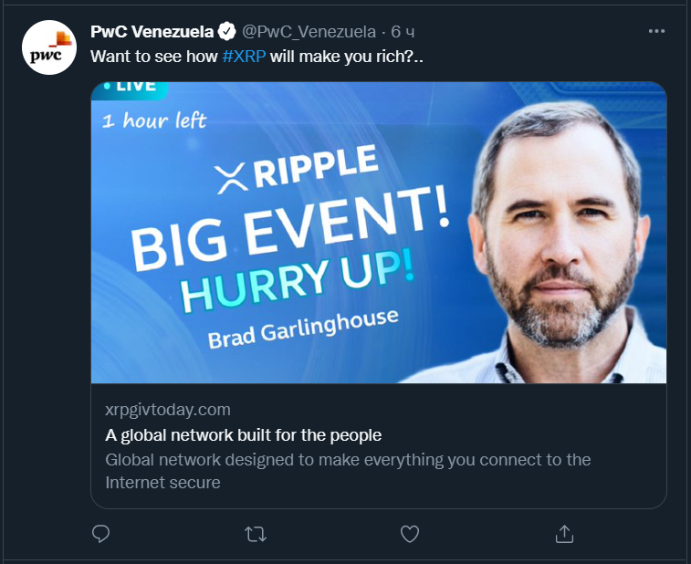 Сайт продвигает «раздачу» криптовалюты XRP. Чтобы получить актив пользователям предлагают пройти по вредоносной ссылке. На момент написания фишинговые твиты остаются на странице PwC Venezuela.