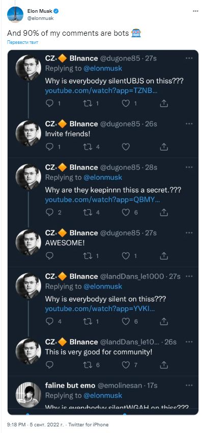 Позднее Чжао присоединился к дискуссии, подтвердив, что 90% комментариев под твитами Маска действительно пишутся ботами.