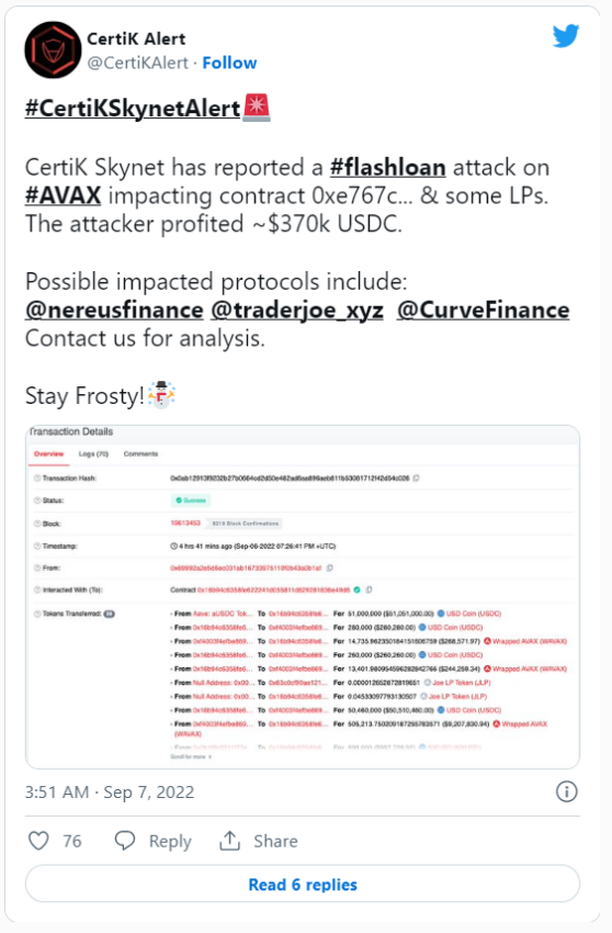 В последние дни все больше и больше проектов страдают от атак флеш-займов. Блокчейн-компания CertiK заявила, что атака флеш-займа на блокчейн Avalanche привела к краже $370 000 у смарт-контракта и поставщиков ликвидности. Curve Finance также входит в число пострадавших от такого вида взлома.
