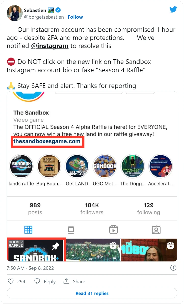 Что произошло? Представители метавселенной The Sandbox сообщили о взломе официального Instagram-аккаунта проекта. Злоумышленники разместили фишинговую ссылку в описании профиля. Сооснователь игры Себастьян Борже написал в Twitter, что хакерам удалось обойти двухфакторную аутентификацию и другие защитные инструменты соцсети. Он призвал пользователей никак не взаимодействовать с аккаунтом, команда проекта уже обратилась в техподдержку Instagram.