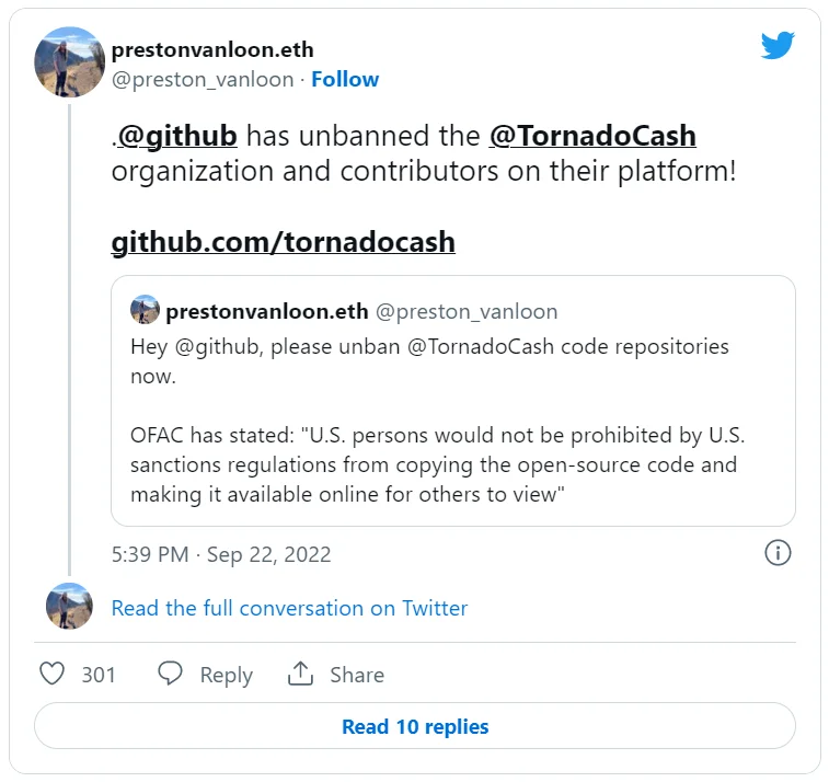 Что произошло? Разработчик Ethereum Престон Ван Лун сообщил, что сервис для хостинга IT-проектов и совместной разработки GitHub восстановил доступ к исходному коду криптовалютного микшера Tornado Cash на своей площадке. Репозитории кода Tornado Cash сейчас находятся в режиме «только для чтения», это означает, что GitHub еще не восстановил полную функциональность. По словам Ван Луна, это «прогресс по сравнению с прямым запретом». Разработчик также призвал GitHub отменить все действия и вернуть репозиториям прежний статус.