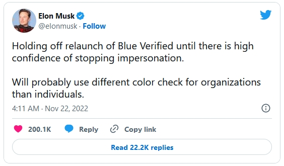 На это обратили внимание журналисты издания Motherboard. По их наблюдениям, впервые видео появилось в аккаунте S4GE_ETH, имевшем верификацию. После покупки Twitter Илон Маск дал возможность каждому пользователю соцсети приобрести отметку о верификации за 8 долларов в месяц, однако после наплыва мошенников, отказался от этой идеи.