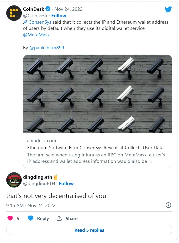 Обновленная политика конфиденциальности ConsenSys вызвала неоднозначную реакцию криптосообщества. Некоторые пользователи Twitter недовольны этим шагом, который, по их мнению, нарушает главную идею пространства цифровых активов — децентрализацию.