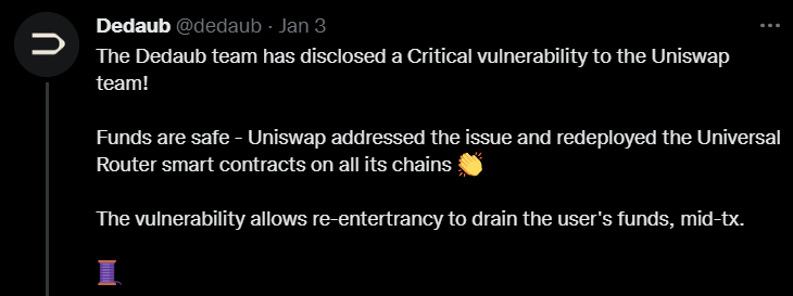Аудиторская фирма Debaub идентифицировала критическую уязвимость в одном из протоколов Uniswap, которая позволяла красть криптовалюту через удаленный запуск вредоносного кода. Об этом аналитики сообщили у себя в твиттере.