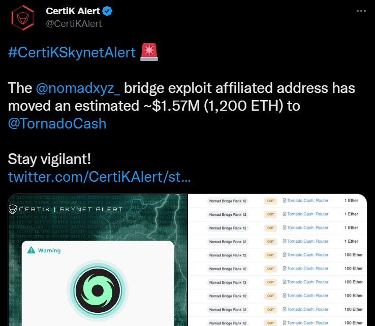 Неизвестные, связанные со взломщиками кросс-чейн моста Nomad, отмыли 1200 ETH (почти $1,6 млн) с помощью подсанкционного миксера Tornado Cash. Об этом у себя на странице в твиттере сообщили аналитики ресурса CertiK.