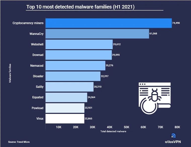 Согласно исследованию Atlas VPN, в первой половине 2021 года вредоносное ПО чаще всего обнаруживалось в программах для майнинга криптовалюты – 74 490 таких угроз были обнаружены в процессе, получившем название «криптоджекинг».