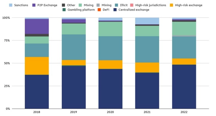 При этом использование миксеров, включая попавший под санкции Tornado Cash, увеличилось с 11,6% до 15% в 2022 году.