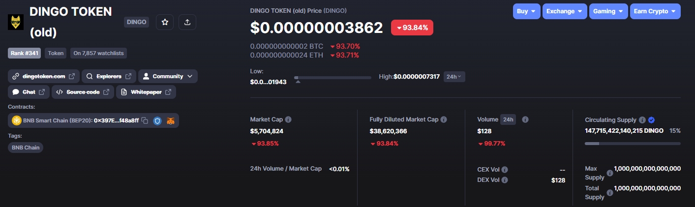 По данным CoinMarketCap, капилизация токена за последние 24 часа обвалилась почти на 94% — примерно до $5,7 млн.