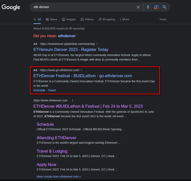 Злоумышленники использовали платную рекламу Google для продвижения своего сайта. В Cointelegraph обратили внимание, что в выдаче поисковика вредоносный URL-адрес оказался вторым после оригинального ETHDenver.