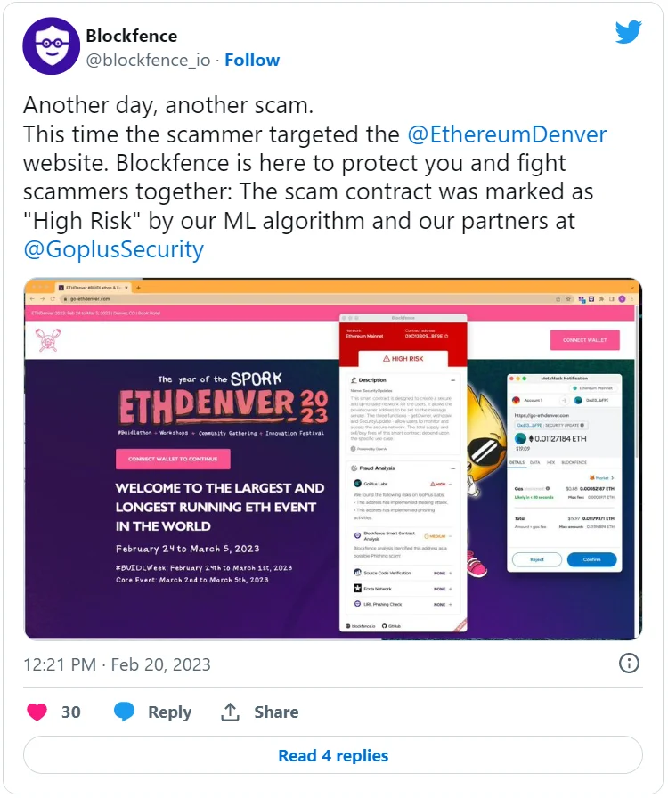 В интервью Cointelegraph глава Blockfence Омни Лахав сообщил, что мошенники оплатили рекламу в Google для продвижения поддельного сайта. В результате этих действий его URL появлялся на втором месте в поисковике, выше реального сайта конференции ETHDenver. Лахав также допустил, что этот вредоносный смарт-контракт может использоваться и на других фишинговых веб-страницах.