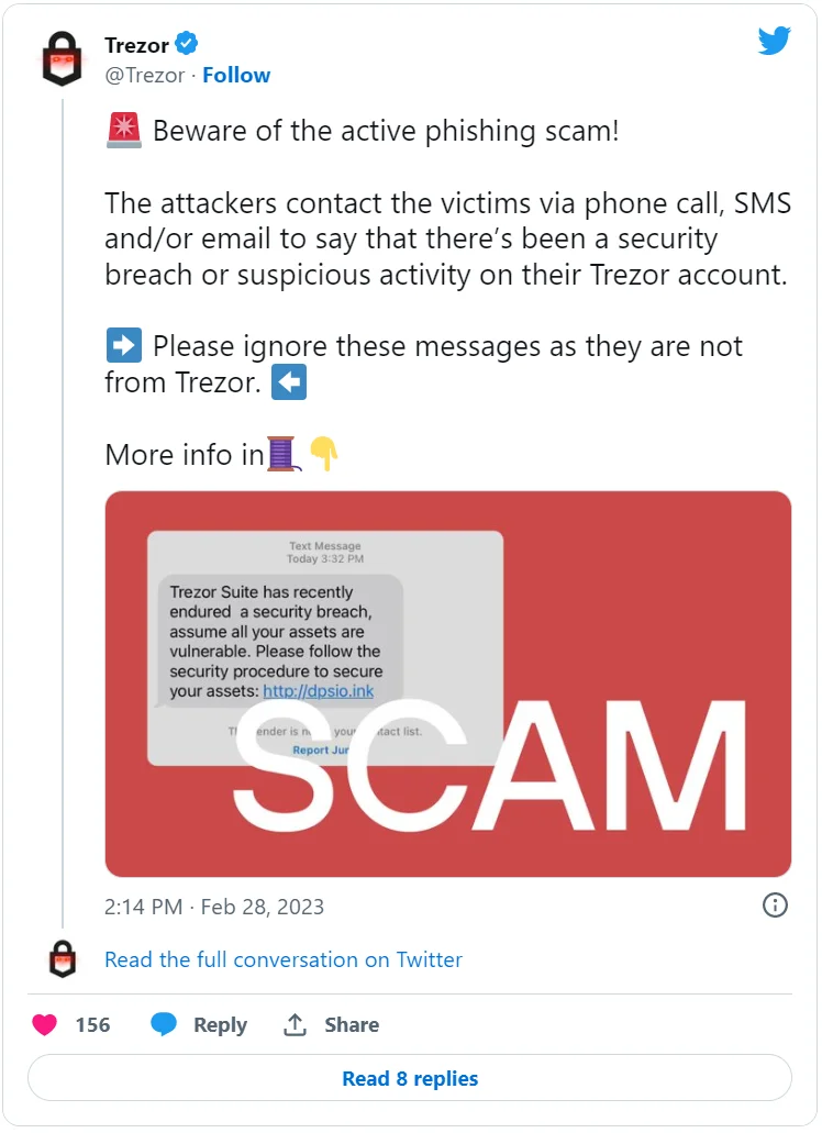 Что еще сообщили в Trezor? Представители компании подчеркнули, что никогда не будут связываться со своими клиентами посредством звонков или SMS. Они также заверили, что никаких доказательств возможного взлома базы данных не было обнаружено. После этого один из подписчиков поинтересовался, как тогда мошенники могли узнать, что он является владельцем устройства Trezor. В ответ в компании допустили, что жертвы атаки выбираются случайным образом. Вероятно, за счет массовой рассылки у злоумышленников есть шансы обратиться в том числе к клиентам компании.