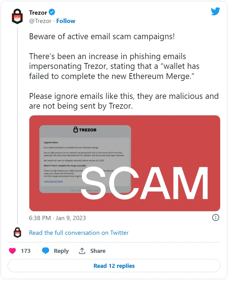 9 января представители кошелька также предупреждали о фишинговых атаках по электронной почте. Тогда злоумышленники, выдающие себя за Trezor, рассылали письма, в которых говорилось, что «кошелек не смог завершить новое слияние Ethereum».