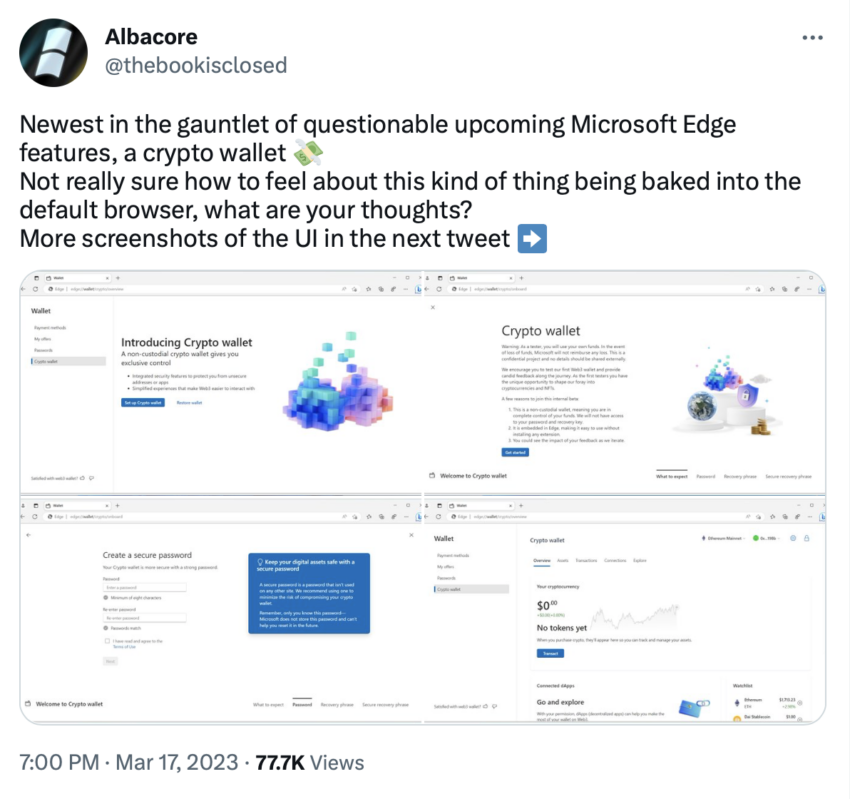 Исследователь программного обеспечения @Albacore поделился в «Твиттере» скриншотами, которые ясно дают понять, что компания сделала важный шаг и добавила в дефолтный браузер Edge код, позволяющий интегрировать в него некастодиальный криптокошелек.