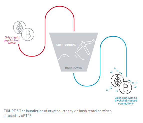 Методы отмывания украденной криптовалюты у Северной Кореи разнятся от случая к случаю. Например, в 2020 году курируемая режимом группировка Lazarus Group отмывала украденную криптовалюту через китайцев в США. Посредники покупали подарочные карты iTunes Apple за «грязную» криптовалюту на некоторых биржах, а после использовали карты для покупки уже чистого биткоина.
