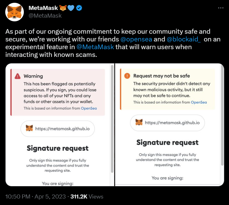 Новая функция пока что находится в разработке с NFT-маркетплейсом OpenSea и блокчейн-фирмой Blockaid. При этом MetaMask не будет отвечать за учет мошеннических адресов, а просто отслеживать данные маркетплейса и блокчейн-фирмы. Как скоро нововведение будет доступно для пользователей MetaMask, неясно.
