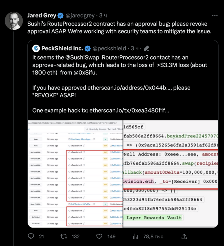 Популярная децентрализованная биржа (DEX) SushiSwap стала жертвой эксплойта, который привел к потере более $3,3 млн по крайней мере одним пользователем. Взлом связан с уязвимостью в смарт-контракте RouteProcessor2 – он используется для маршрутизации торговли. Глава платформы Джаред Грей и специалисты Peck Shield рекомендовали отозвать одобрения на всех блокчейнах.