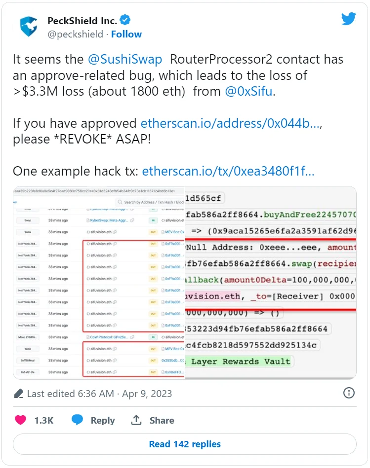 Что произошло? 9 апреля ошибка в смарт-контракте децентрализованной биржи (DEX) SushiSwap привела к потере 3,3 млн долларов в монетах ETH. Так, компания PeckShield, специализирующаяся на кибербезопасности, сообщила о необычной активности, связанной с функцией одобрения в смарт-контракте Router Processor 2 протокола Sushi, который агрегирует торговую ликвидность из нескольких источников и определяет наиболее выгодную цену для обмена монет.