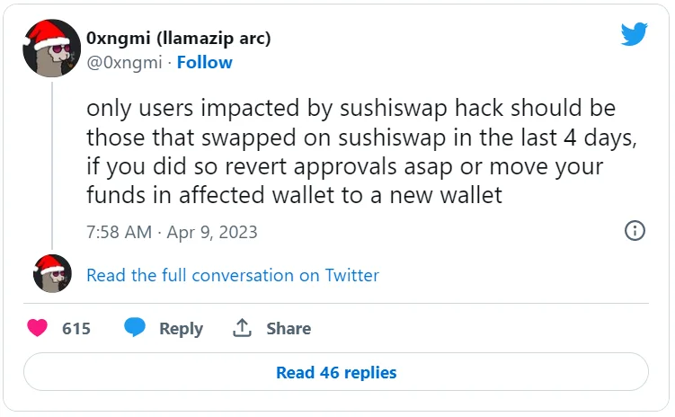 Гендиректор SushiSwap Джаред Грей подтвердил, что RouteProcessor2 имеет ошибку одобрения и призвал пользователей отозвать разрешения на все контракты протокола. Он сообщил, что платформа работает с командами безопасности над устранением уязвимости. Так, на GitHub был создан список контрактов, требующих отзыва одобрения, в нескольких блокчейнах.