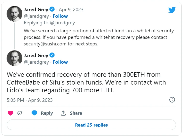Через несколько часов после инцидента Грей заявил, что значительная часть средств была восстановлена с помощью белых хакеров. Он добавил, что команда SushiSwap ведет переговоры с представителями протокола ликвидного стекинга Lido Finance относительно возврата еще 700 ETH (~1,3 млн долларов).