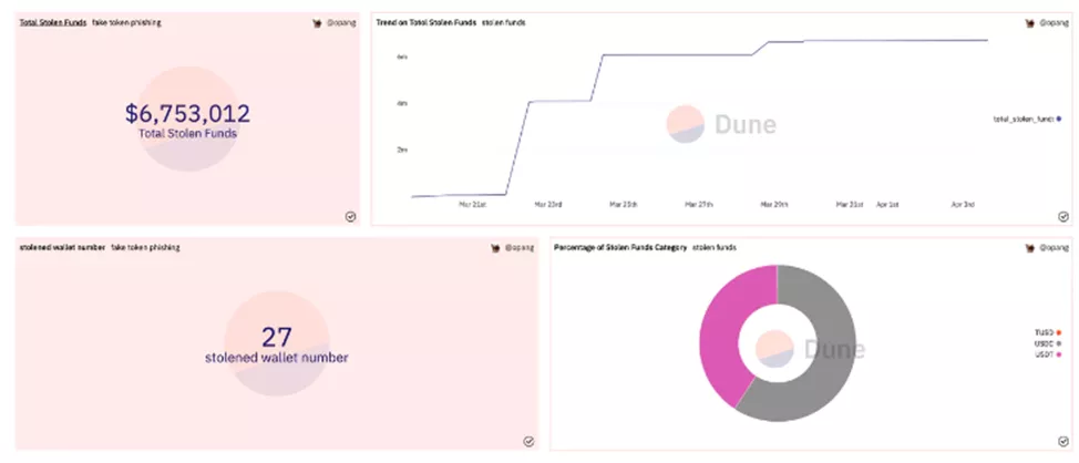 С 18 марта злоумышленник потратил 158 ETH для осуществления 423 751 подобных атак на 102 553 адресов. Жертвами стали 27 пользователей, которые лишились $6,75 млн в пропорции 60%:40% в USDT и USDC.